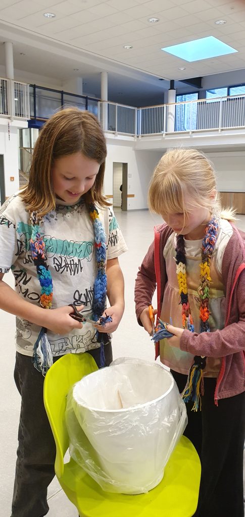 Liv und Jelte aus der Klasse 4b haben im Ganztag mit Frau Peuser ihren eigenen Schal gehäkelt. Das hat viele Stunden Arbeit und eine Menge Durchhaltevermögen gebraucht. Dieser Schal wird die beiden immer an ihre Grundschulzeit erinnern – passend zu den kalten Tagen sind diese nun fertig geworden.