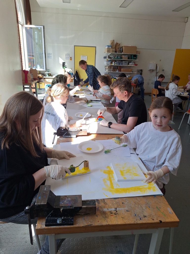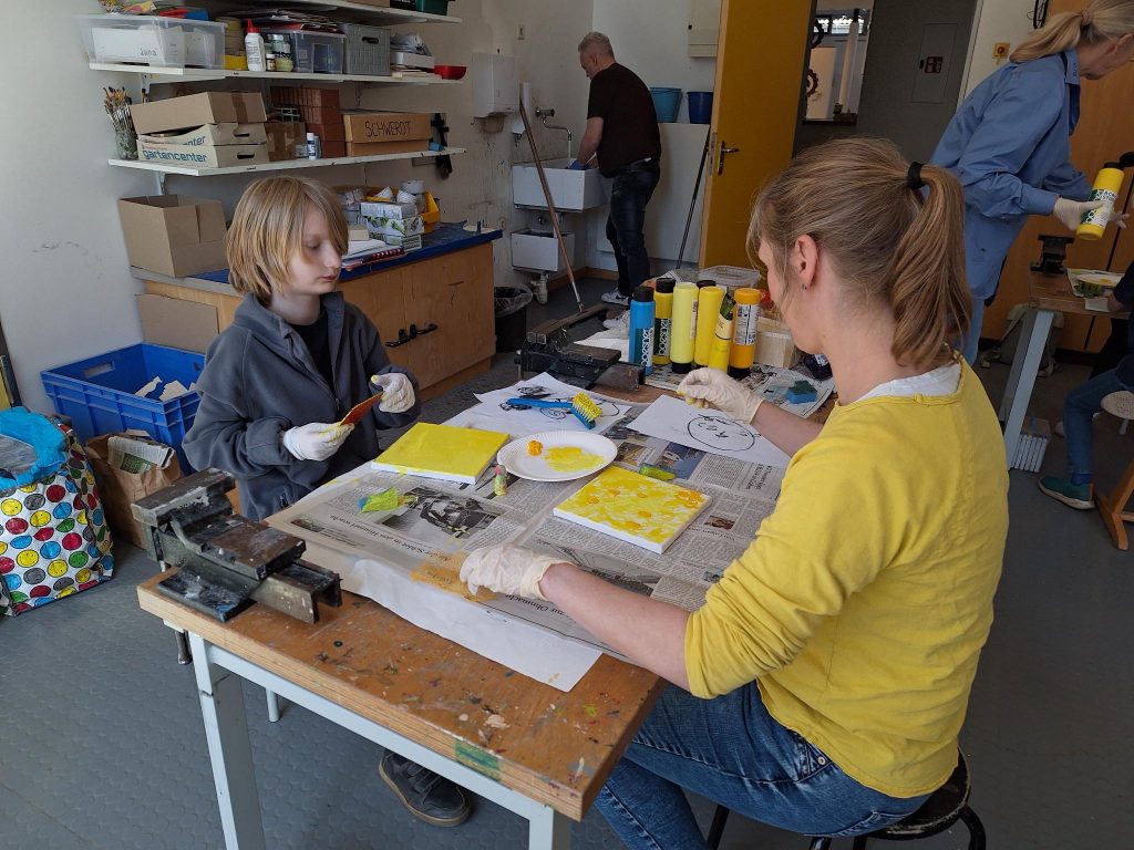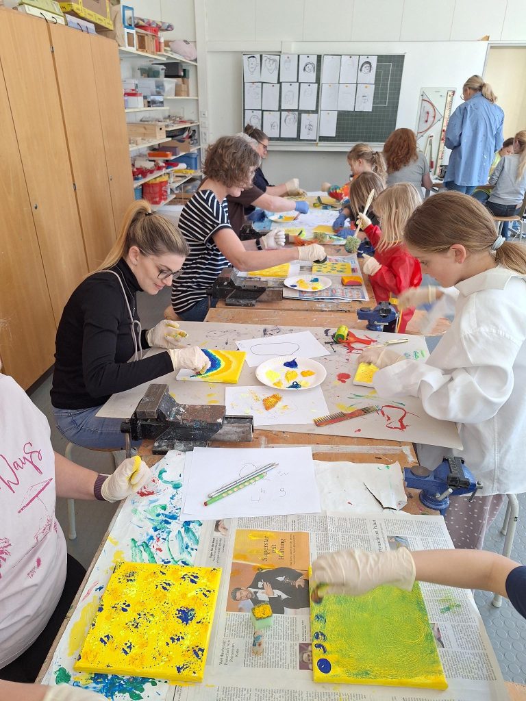 Nach diesem Aufwärmbild ging es dann mit Leinwand und verschiedenen Malutensilien weiter. Erst wurde in 5 Gelbtönen experimentiert, dann kamen 5 Blautöne hinzu. Es wurde getupft, gestrichen, gewischt und gespachtelt. Es entstanden wunderschöne Kunstwerke!