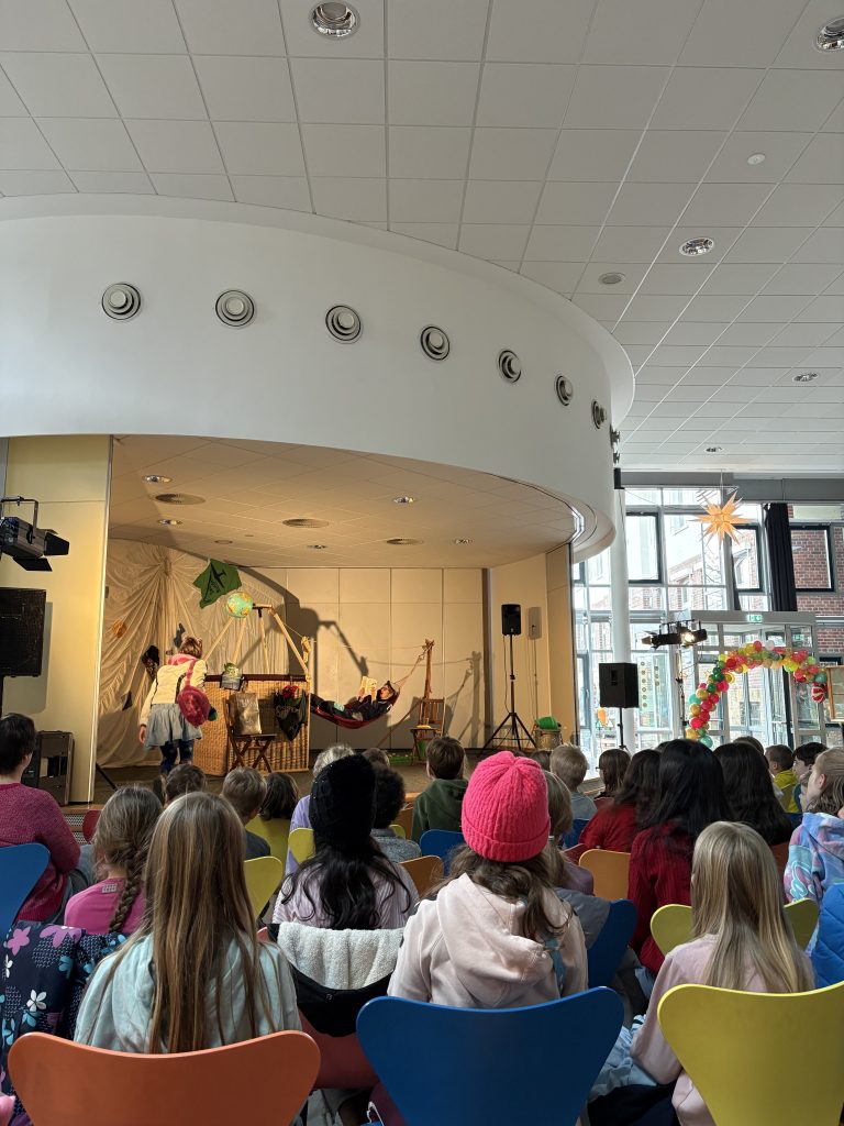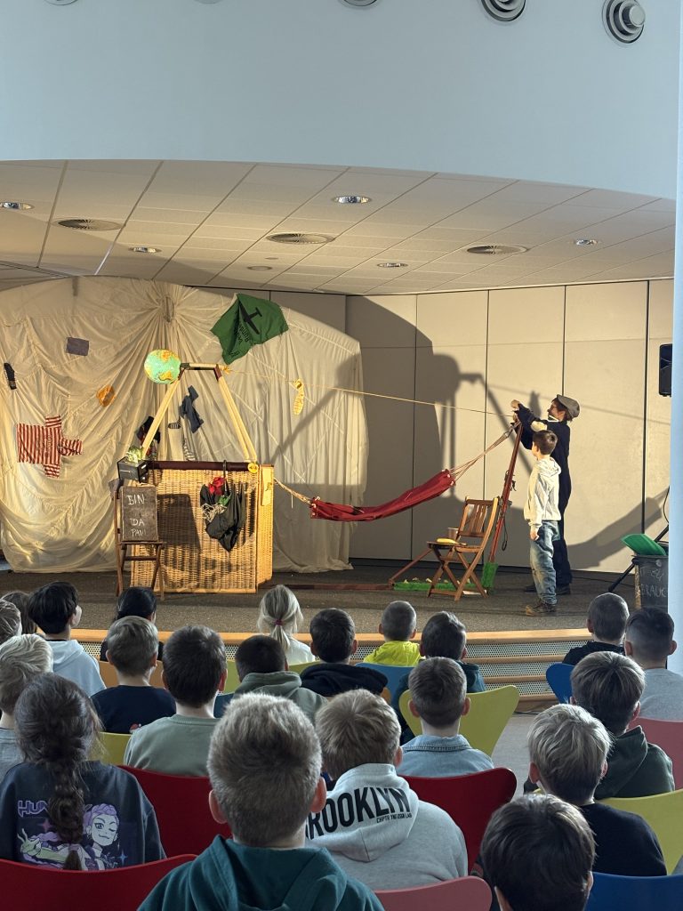 Heute war das Theater LUPE mit ihrem Theaterstück „Nie genug von Sumsebar“ bei uns in der Schule zu Gast. In dem Theater stück geht es um Paul, einen eigenwilligen Tüftler, der alleine in einem alten Ballonkorb wohnt. Statt neue Dinge zu kaufen, sammelt er Geräusche, repariert und baut alles aus kaputten Gegenständen. Upcycling ist für ihn nicht nur ein Hobby, sondern einfach selbstverständlich, weil: Paul schmeißt nichts weg!