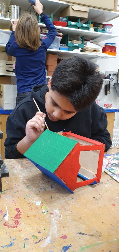 Im Ganztag haben die Kinder gemeinsam mit Frau Peuser ein Futterhäuschen für die Vögel im Winter gebaut und bunt angemalt. Alle Teile wurden selbst ausgesägt, geleimt und mit Nägeln zusammengehämmert. Anschließend wurden die Häuschen wetterfest bemalt und ein kleiner Haken ins Dach geschraubt. Nächste Woche dürfen die Häuser mit nach Hause genommen werden.